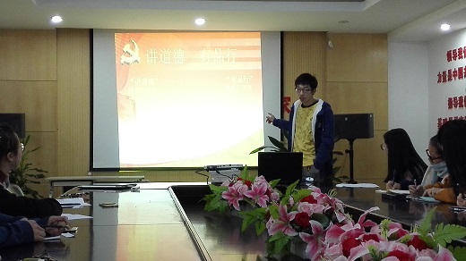 第八支部的李煜同志以“讲政治,有信念”为主题,从两学一做中提炼出“合格党员”的标准。从信念的学习对象出发,联系全体党员的实际情况,提出针对性的五大问题。信念是我们的精神支柱,也是我们作为党员发挥榜样作用的精神来源。每一位党员都要有自己坚定不移的信仰。同时,李煜同志以自身出发,结合她参加的活动包括整理车库、大罗山公益之行等等,这些活动都是我们展现自身价值与信念的平台。